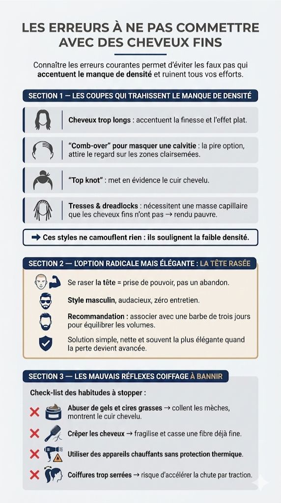 Au lieu de camoufler vos complexes, ces styles braquent les projecteurs pile sur les zones clairsemées. C’est un contre-sens esthétique total.