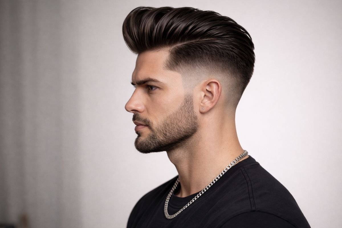 Le secret d’un Pompadour réussi réside dans l’équilibre parfait entre la hauteur de la mèche et la netteté des tempes.